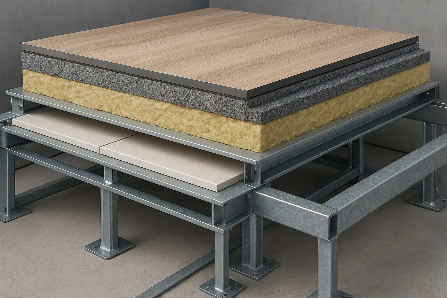 اجرای کف کاذب با زیرسازی ال اس اف (LSF) روشی نوین و سبک برای ساخت کف در ساختمان‌های مدرن است که با استفاده از شبکه فلزی سبک و صفحات پیش‌ساخته، وزن سازه کاهش یافته و سرعت اجرا افزایش می‌یابد. این سیستم با رعایت استانداردهای بین‌المللی، تحمل بار بالا و عایق‌بندی صوتی مطلوبی فراهم می‌کند و انتقال صدا و لرزش را به حداقل می‌رساند. تفاوت اصلی آن با کف‌سازی سنتی در وزن کمتر، نصب سریع‌تر، امکان دسترسی آسان به تاسیسات زیرکف و سهولت تعمیر است. اجزای اصلی شامل شاسی‌کشی فلزی، صفحات گچی یا الیافی، عایق صوتی و پوشش نهایی مانند پارکت یا موکت است. اجرای دقیق و اتصالات صحیح صفحات با چسب، پیچ و منگنه از اهمیت ویژه‌ای برخوردار است تا از نفوذ رطوبت و گردوغبار جلوگیری شود. این سیستم برای ساختمان‌های اداری، مسکونی و پروژه‌های بازسازی مناسب بوده و با انتخاب مصالح استاندارد، مقاومت در برابر رطوبت، آتش و سایش تضمین می‌شود. استفاده از لایه‌های عایق صوتی و طراحی اصولی شاسی‌کشی، انتقال صدا را کاهش می‌دهد. اجرای کف کاذب LSF نیازمند تخصص و رعایت نکات فنی است تا دوام، ایمنی و عملکرد مطلوب کف حفظ گردد. این روش به‌ویژه در فضاهایی با نیاز به عبور تاسیسات و کاهش وزن سازه، بهترین گزینه محسوب می‌شود.