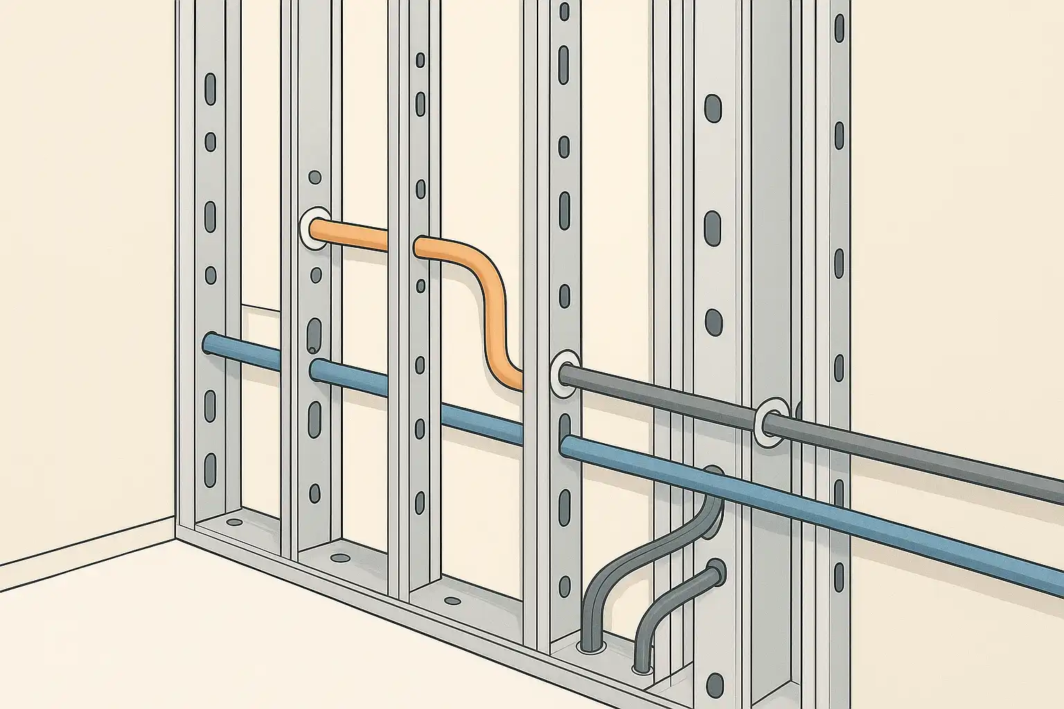 اجرای تاسیسات برق و مکانیک داخل دیوارهای سازه ال اس اف (LSF) نیازمند رعایت استانداردهای دقیق سوراخ‌کاری و حفاظت کابل‌ها است تا از کاهش استحکام سازه و خطرات ایمنی جلوگیری شود. استفاده از دستگاه پانچ برای ایجاد سوراخ‌های استاندارد و بهره‌گیری از غلاف‌های پلاستیکی یا بوش محافظ، از آسیب‌دیدگی کابل‌ها جلوگیری می‌کند و طول عمر تاسیسات را افزایش می‌دهد. عبور تاسیسات در دیوارهای LSF نسبت به سازه‌های سنتی با تخریب کمتر، سرعت بالاتر و مدیریت بهتر فضا همراه است. برنامه‌ریزی دقیق، هماهنگی تیم‌های سازه، برق و مکانیک و استفاده از نرم‌افزارهای تخصصی مانند AutoCAD MEP و Revit، موجب اجرای اصولی و ایمن می‌شود. مزایای این روش شامل دسترسی آسان برای تعمیرات، کاهش هزینه‌های نگهداری و زیباسازی فضا است، اما نیاز به دقت بالا و هماهنگی دقیق بین تیم‌ها دارد. استفاده از برندهای معتبر ایرانی و خارجی برای تجهیزات حفاظتی کابل‌ها توصیه می‌شود. همچنین سوراخ‌کاری باید پیش از نصب کامل دیوارها انجام شود و رعایت نکات ایمنی از جمله عدم عبور همزمان کابل برق و لوله‌های آب ضروری است. این روش اجرای تاسیسات، ضمن افزایش ایمنی و کیفیت ساخت، به صرفه‌جویی اقتصادی در بلندمدت کمک می‌کند.